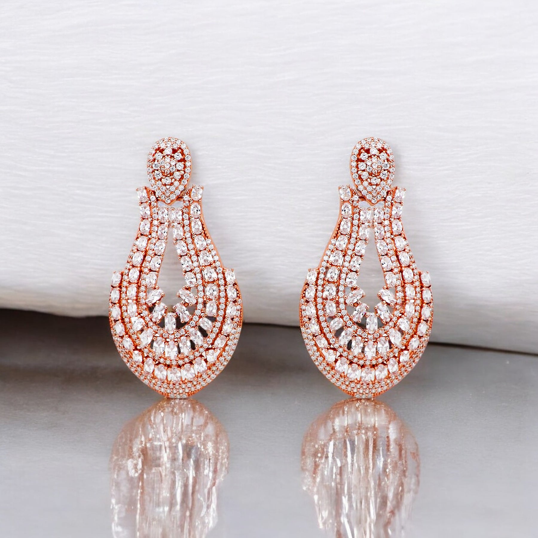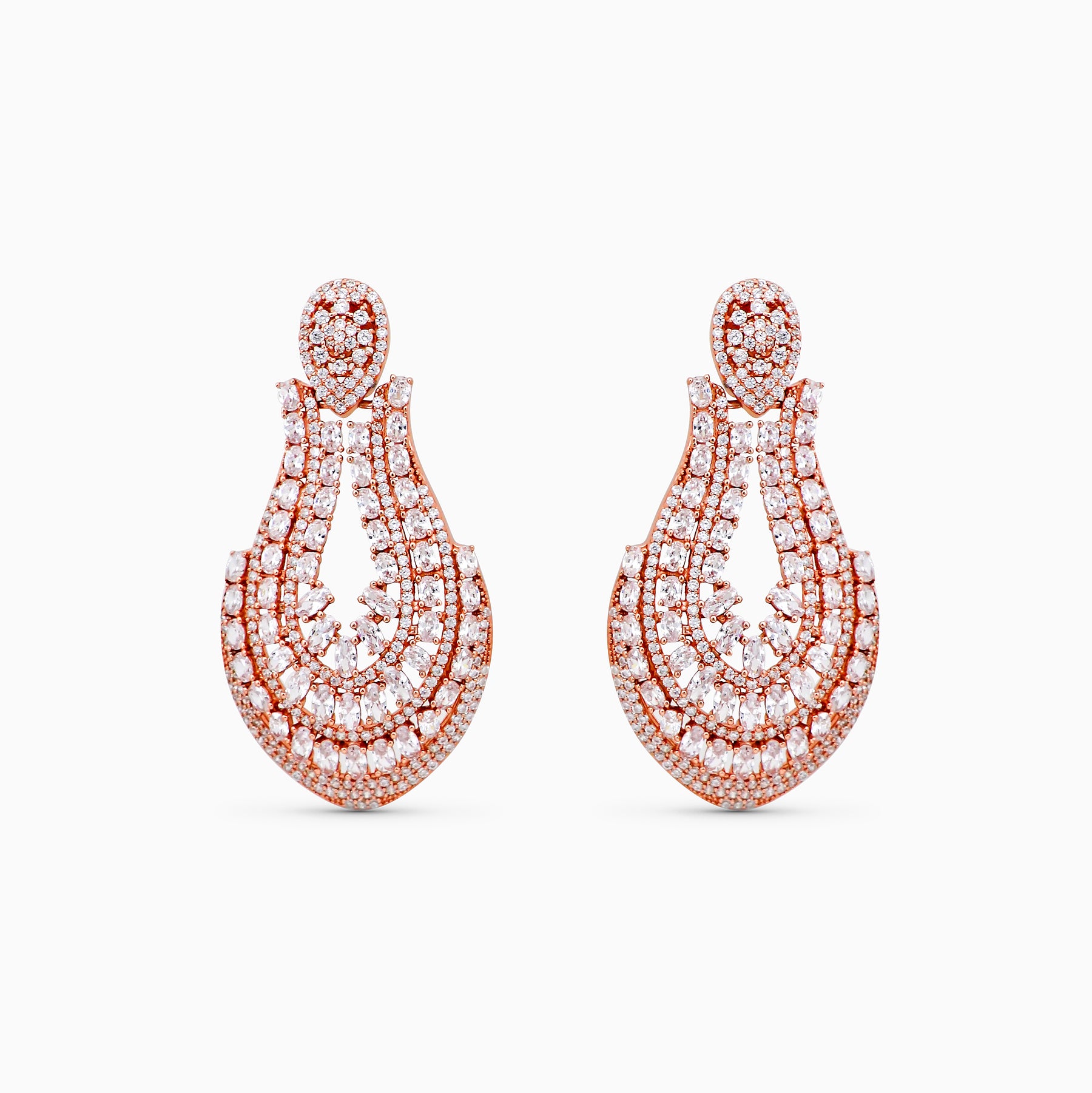 Make a statement with these big and beautiful silver tear drop earrings, coated in a luxurious rose gold finish and studded with sparkling CZ stones. Be the center of attention at any party with this eye-catching accessory.