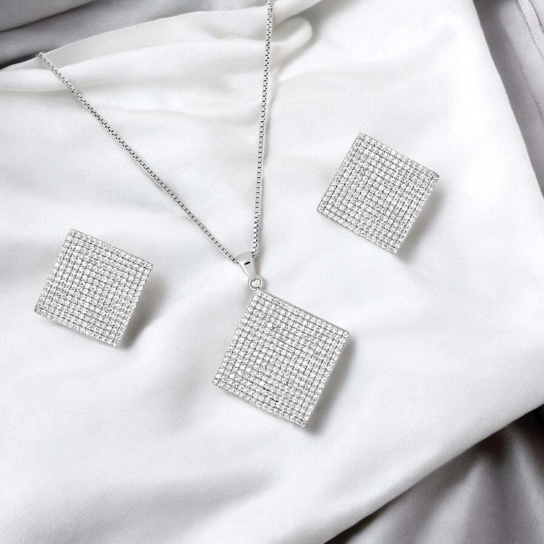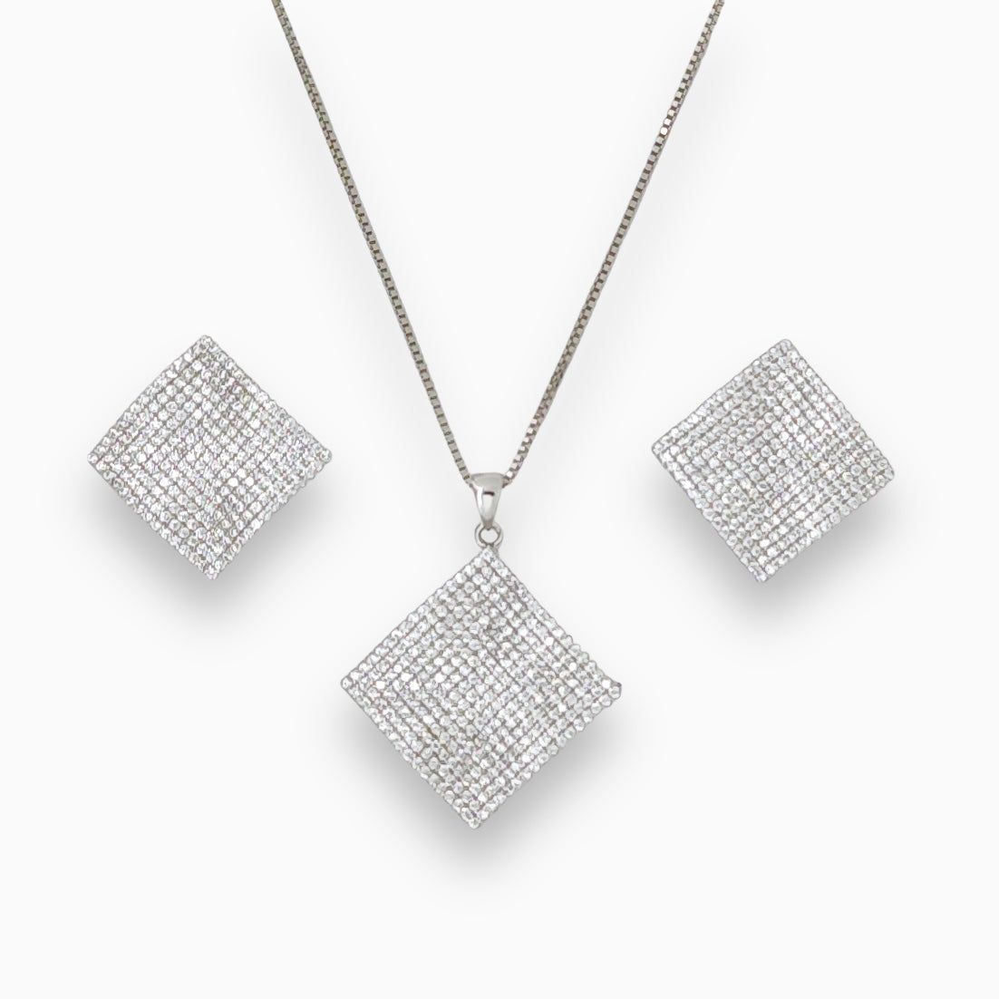 Enhance your party look with our stunning designer silver pendant and matching earring set. Made for the modern woman, this set features a beautiful diamond shape design that adds a touch of elegance to any outfit. Upgrade your jewellery collection with this must-have set.